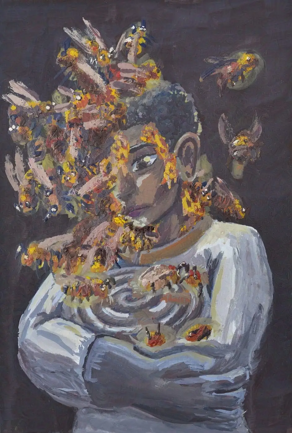Gouache base with encausic bees. They're chunky, but that's what I you get for painting with a clothes iron and palette knife.